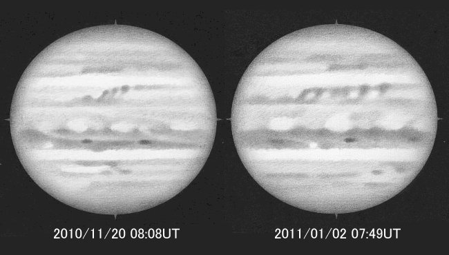 前回は2010年11月に発生し、激しい活動でSEBを濃化させただけでなく、南分枝の暗斑群によって大赤斑が淡化し、翌年の木星面を一変させてしまいました。
