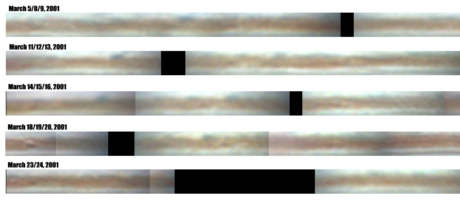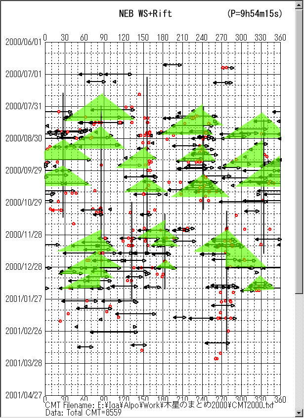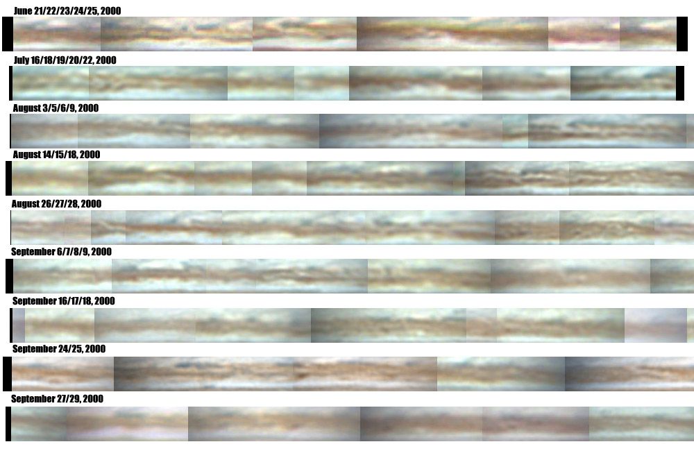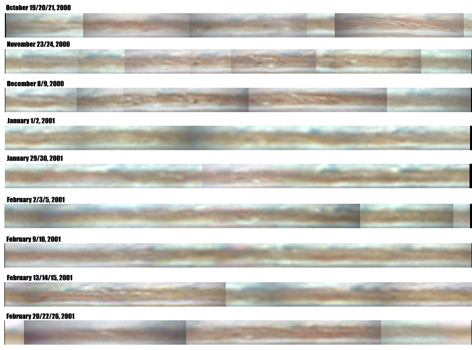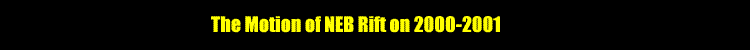 There were many rift structures on NEB in the apparition of 2000-2001. I generated 24 strip maps and measured the longitudes of white spots and rifts on NEB from CCD images. A small white spot occurs in the center of NEB, and it grows toward the east and west by the sheared jetstream and toward the north and south at the same time. Finally it grows to the rift of NEB. Because the rift is supplied from the new white spot, it is extended more toward the east and west. The rift grows up to 15-30 days, and disappears gradually after it has 110 degrees length of longitude. The white spots occur one after another in the same location of NEB, then its generate a new rift. These sources are identified to eight locations, and these have 9h54m15s of the averaged rotation period. Also, these sources themselves live until 3 to 5 months.