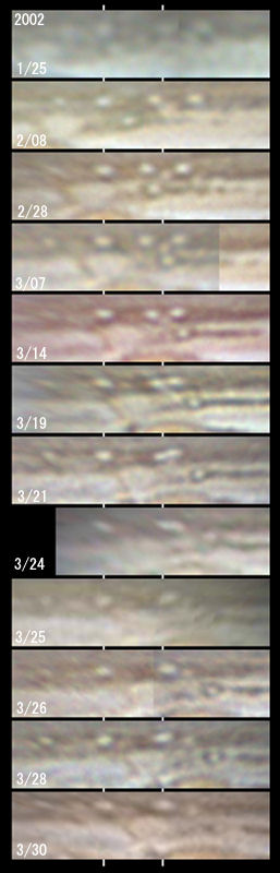 SSTB白斑のマージSSTB(南南温帯縞)にある4個の小白斑のうちの2個がマージ(合体)して、新たな1個の白斑になる貴重な現象が観測されました。これらの小白斑はちょうど"BA"の南にあり、白斑どうしの距離が縮まっていることが分かっていました。後方の2個の白斑が2月に8°まで接近すると、白斑の間に逆回転の渦ができ、接近をさまたげているかのようでした。 しかしながら、3月14日UTに中間の白斑が消失すると、2個の白斑は急速に接近し、19日UTには接触しました。21/24日UTの画像からは、2個の白斑がお互いの回りを反時計方向に回転しているようにも思われ、25日UT以降になると1個の白斑にマージしました。マージ後の白斑は、2つの中間の経度に位置し、お互いの白斑が引き合うようにマージしています。白斑どうしのマージは、これまでSTB白斑(BEやBAが生まれた)で観測されていましたが、同じ永続性の渦であるSSTB白斑でも観測されたことによって、メカニズムが解明されそうです。 | ||