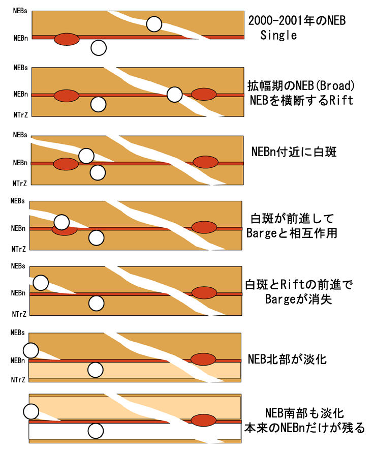 2001-02年のNEBの活動2001-02年のNEB(北赤道縞)は、前シーズンから始まったNTrZへのベルトの幅の拡張が全周に渡り、NEBの拡幅期をむかえた。前回のNEB拡幅は1996年で、5年ぶりである。拡幅によってNEBの中央にbargeが見られ、それらをつなぐようにNEB中央にベルトが出現した。NEB北縁には湾入した白斑notchが多く見られた。 2001年8月-12月(第1期)には、ω2=150°付近で連続的に白斑が発生し、NEBを南北に横断する巨大なriftを形成した。2002年1月-3月(第2期)には、ω2=110°付近のNEBnに白斑が4回連続的に発生し、riftを形成しつつ高速に前進して全周を覆いつくした。2002年4月以降(第3期)には、NEB北部が部分的に明化を始め、NEBの衰退期をむかえつつあった。NEB南部もriftによって全周が明るくなり、本来のNEBnだけが中央部にベルトとして残っていた。 | ||||