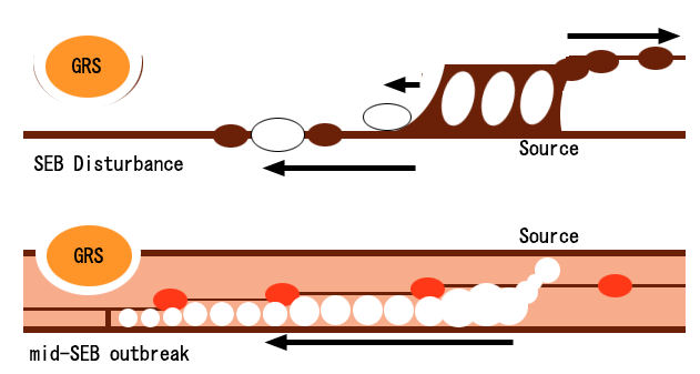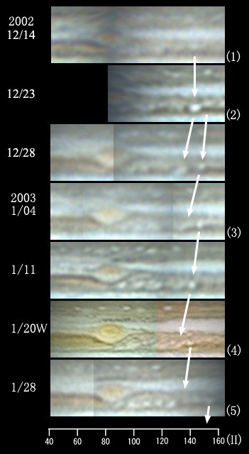 mid-SEB outbreak in 2002-03On 2002 December, a new mid-SEB outbreak appeared at L2 = 143. Some bright spots erupted repeatedly from the source, and moved forward quickly. This outbreak occurred following of the GRS, but the outbreak was separated with the post-GRS disturbance. The secondary outbreak occurred at the same source on December, also another three outbreaks occurred on 2003 January. These outbreaks disappeared on March. The source of present mid-SEB outbreak was located at 59 degrees following of the GRS, so it was the minimum distance between the GRS and the source. I found the another two outbreaks which had short distance between the GRS and the source. I suspect that the activities on 2001 January and 2001 December might be the mid-SEB outbreak. | ||||||||