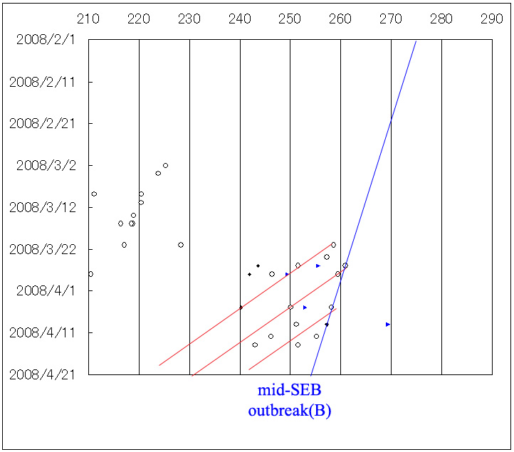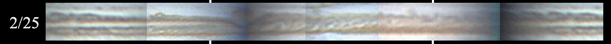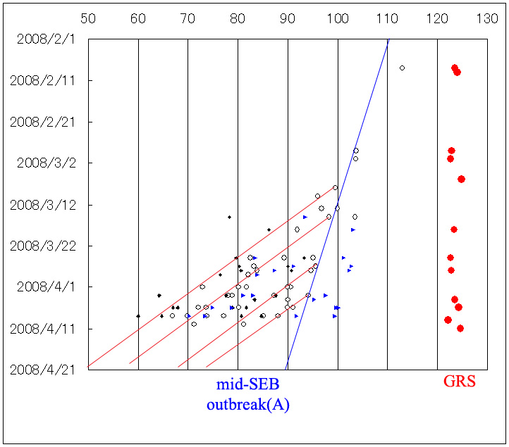 同時に2個のmid-SEB outbreakが発生mid-SEB outbreakはSEB内白斑突発現象であり、SEB(南赤道縞)南部に発生した明るい白斑が、シアーされた帯状流によって東西方向に引き伸ばされて、SEBを前進し続けて、SEBを白斑で埋めつくしていく現象である。 今回のmid-SEB outbreakは、3月13日の発生が観測された11日後には、別な場所にも同時に発生する様子が観測された。 それぞれのmid-SEB outbreakでは、ゆっくりと前進する発生源から7〜10日間隔で明るい白斑が出現している。発生した白斑はシアーされた帯状流によって東西方向に引き伸ばされて、前方に拡がっていく。 mid-SEB outbreakは、2000年以降は毎シーズンのように観測されているが、大赤斑の後方100度以内に発生していて、あまり活発なものではなかった。今回のように、大赤斑の前方に発生したoutbreakは1998年以来のことで、今シーズンは活発なoutbreakの活動が見られるかもしれない。 その他のSEBの状況南熱帯の暗斑が大赤斑に飲み込まれる大赤斑直前のSTrZの暗斑は、 SEBs南縁のドーナツ状暗斑として、 2月25日に II=65.6度に、3月1日にII=71.6度に見つかった。このSTrZの暗斑はかなり高速で後退し、4月9日にII=109.9度の大赤斑の直前まで達し、その後大赤斑に飲み込まれたようだ。 南熱帯攪乱STrD-1、STrD-22月24日のII=242.2度と、2月26日のII=176.3度の南熱帯に暗斑が見つかった。阿久津富夫氏の観測から、この暗斑は近赤外画像でドーナツ状であり、メタン画像で明るい。可視光ではオレンジ色のドーナツ状で、高気圧性白斑(anticyclonic oval)である。 2個の暗斑は、それぞれ昨シーズン発生した南熱帯攪乱STrD-1、STrD-2から形成されたようだ。 STrD-2はドリフトがBAよりやや遅いために、近いうちにBAに追い越されるかもしれない。7月下旬ごろには大赤斑の後方に到達する。 | ||