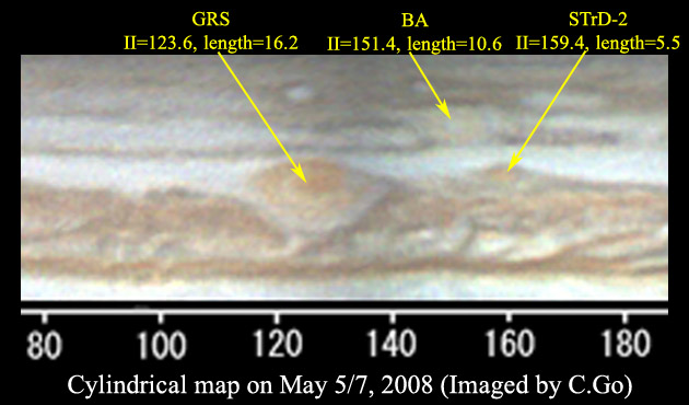 この小赤斑は、2007年のシーズンに同時に発生した南熱帯攪乱の1つであるSTrD-2が変化したものと考えられています。また、小赤斑はメタンバンドで明るく写ることから、木星大気の高層まで吹き上げている渦であり、大赤斑やSTB白斑と同様な高気圧性斑点(anticyclonic oval)です。 昨年の2個の南熱帯攪乱のなごりと思われる高気圧性白斑はゆっくりと前進を続けています。ドリフトチャートから、STrD-2は-0.28度/日(-8.34度/月)、STrD-1は-0.40度/日(-11.9度/月)のドリフトを示しています。このままのドリフトを続けると、STrD-2は6月下旬には大赤斑後方に達すると予想されます。
