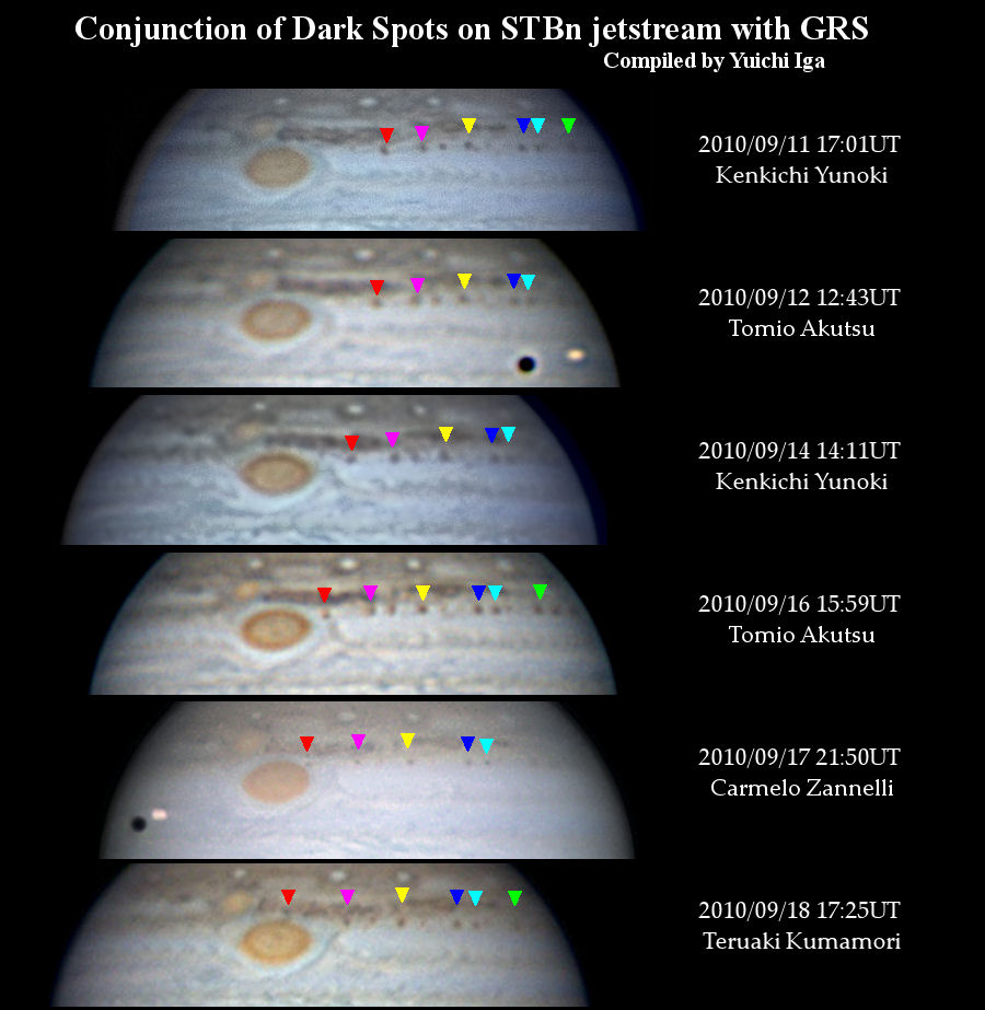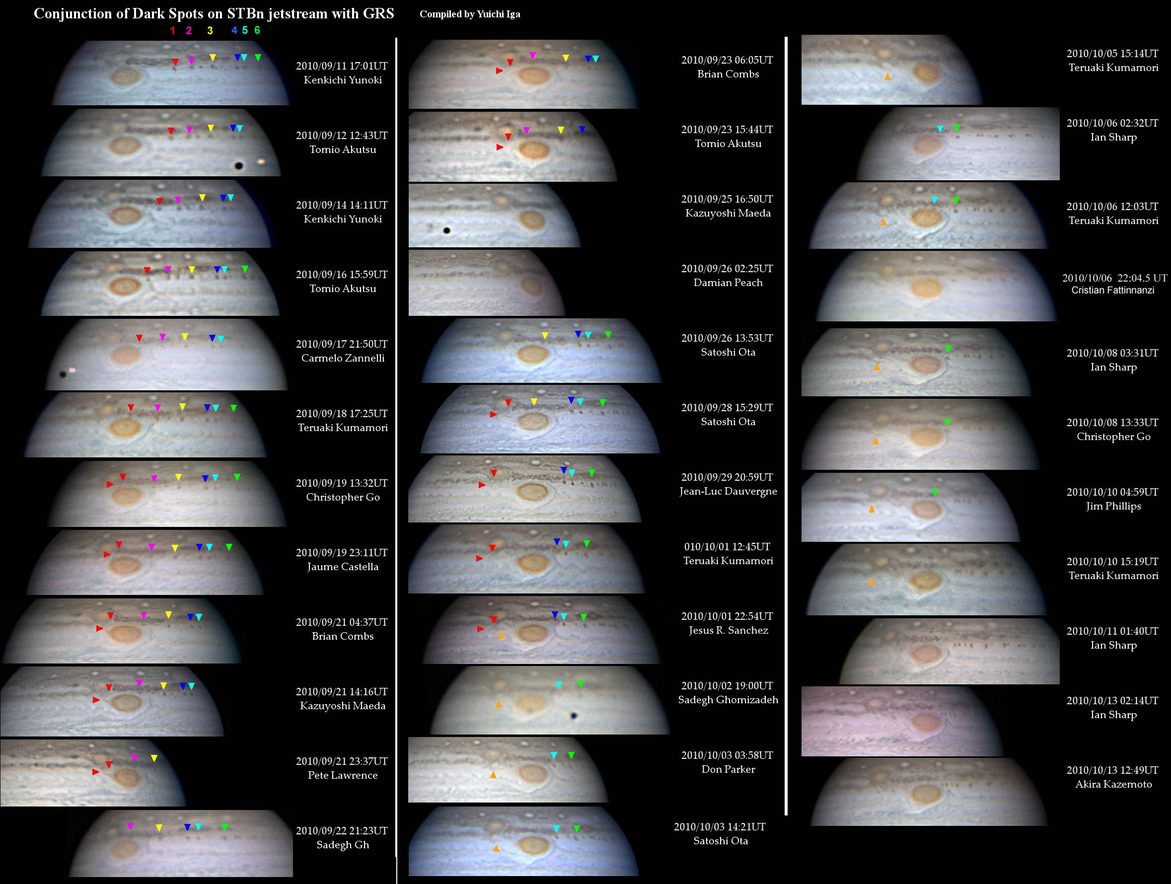 Now that Oval BA has passed the GRS, STB-2 lies alongside it, and a train of STBn jetstream spots has been arriving at the f. end of both. Yuichi Iga has analysed what happens to them. The first two spots veered S to pass between the GRS and STB-2. The first one changed to a white spot as it passed the S side of the GRS, and then expanded into an orange cloud on the p. side of the GRS (Sep.21) - just like the Baby Red Spot did in 2008 -before reassembling into a bright spot on STBn prograding past oval BA. The second spot disappeared as it passed S of the GRS (Sep.23). The third and fourth spots changed into white spots when they reached the f. end of the GRS and STB-2 (Sep.26, Oct.1), then disappeared. The fifth spot also disappeared at the f. end of the GRS and STB-2 (Oct.6). The sixth spot, however, halted at this location and merged into the vertical dark line around the f. side of the GRS (Oct.8). In many of these cases, the last image of the jetstream spot resolved its disruption as a tiny streak.