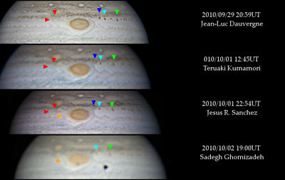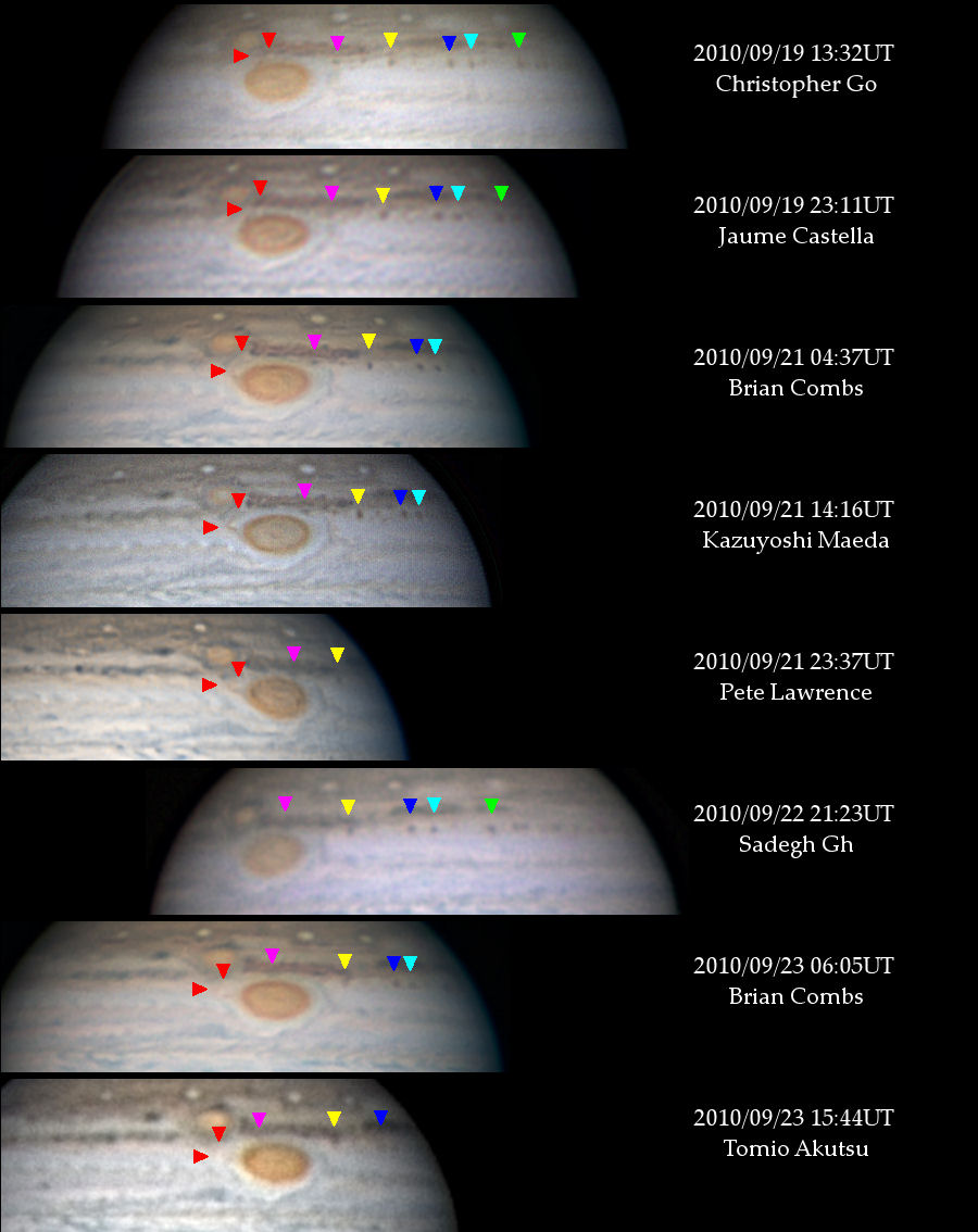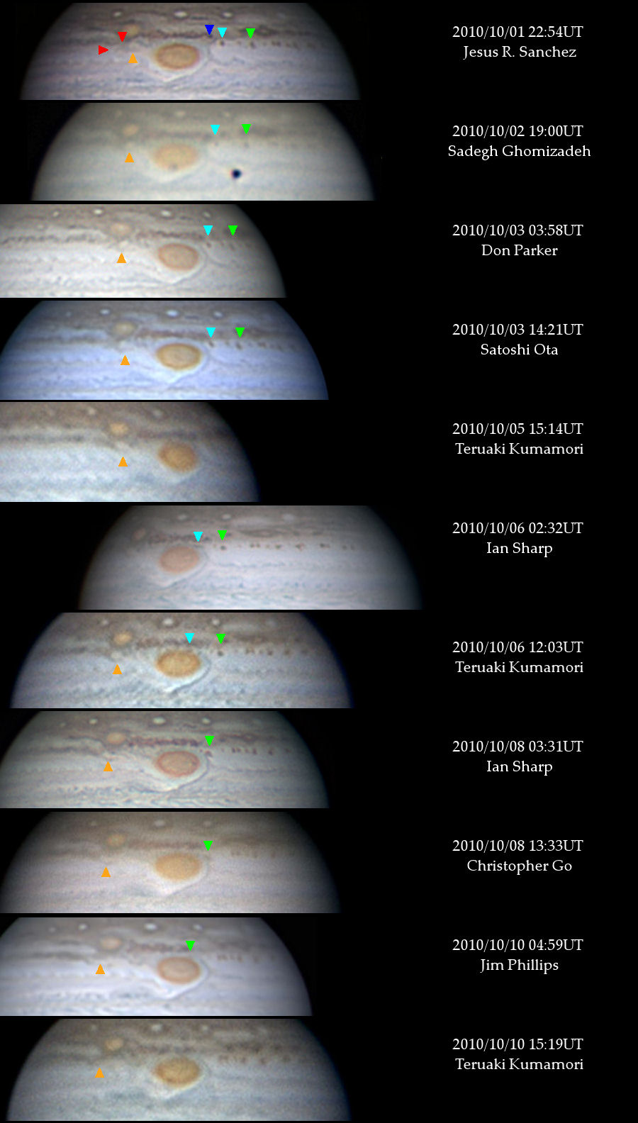 Although all but the first spot disappeared alongside the GRS, traces of them did emerge as a growing stack of oblique bright and dark streaks Sp. the GRS - especially well shown in the v-hi-res images on Sep.28 (S. Ota) and Oct.3 (G. Walker) and Oct.8 (I. Sharp, T.Barry in IR). At least one of these has again rounded up to form another prograding bright spot on STBn alongside oval BA (Oct.1-8). So, the dark spots have all been disrupted, but traces of them survive and can reassemble into vortices after the passage.