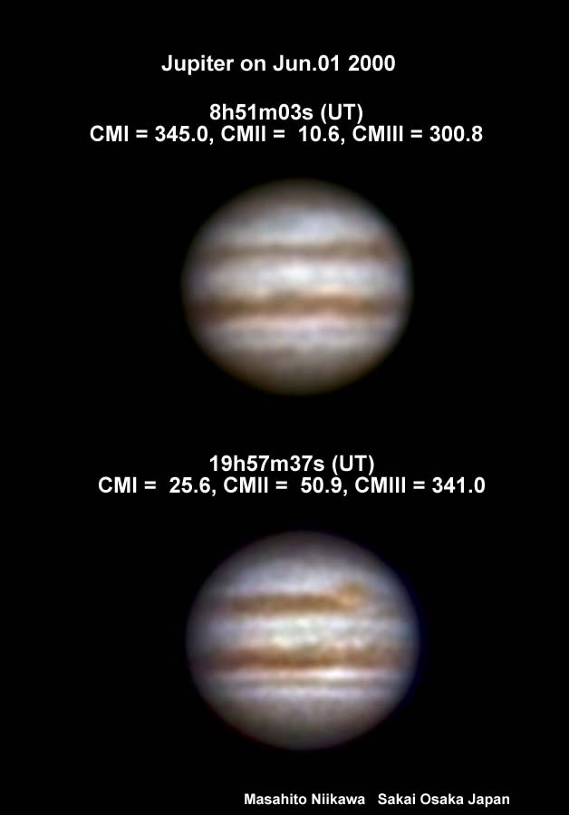 ![]() No. 1 2000/07/01 19h21m(UT) I= 1.9 II= 27.4 III=318.6 No. 2 2000/07/01 19h50m(UT) I= 19.6 II= 44.9 III=336.2