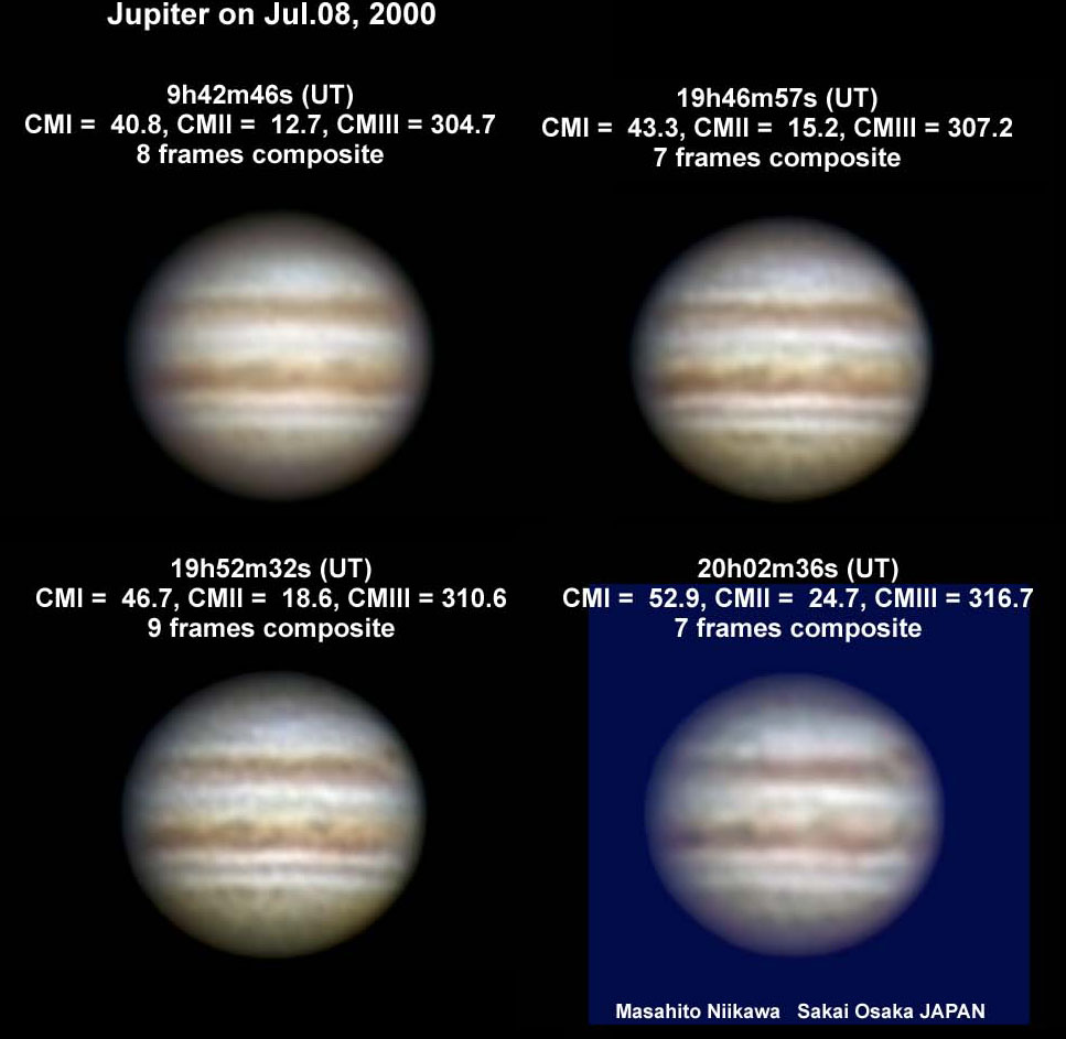 No. 5 2000/07/08 19:42:46(UT) I= 40.8 II= 12.7 III=304.7 1/8sec, 8 frames composite, Seeing:3/10 Transp.:2/6 No. 6 2000/07/08 19:46:57(UT) I= 43.3 II= 15.2 III=307.2 1/8sec, 7 frames composite, Seeing:3/10 Transp.:2/6 No. 7 2000/07/08 19:52:32(UT) I= 46.7 II= 18.6 III=310.6 1/8sec, 9 frames composite, Seeing:3/10 Transp.:2/6 No. 8 2000/07/08 20:02:36(UT) I= 52.9 II= 24.7 III=316.7 1/8sec, 7 frames composite, Seeing:3/10 Transp.:2/6 | ||