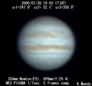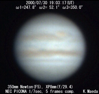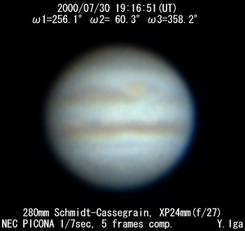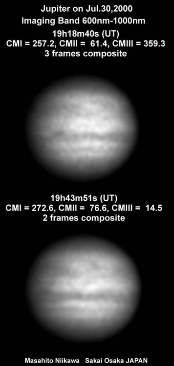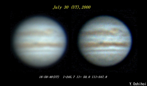 No. 24 2000/07/30 19:18:40(UT) I=257.2 II= 61.4 III=359.3 1/15sec, 3 frames composite, Seeing:1-2/10 Transp.:4/6 No. 25 2000/07/30 19:43:51(UT) I=272.6 II= 76.6 III= 14.5 1/15sec, 2 frames composite, Seeing:1-2/10 Transp.:4/6 | ||