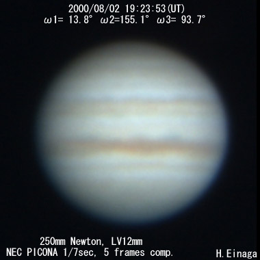 | No.18 2000/08/02 19h02m(UT)ω1= 1.1 ω2=142.3シーイング=6-7/10 透明度=3/5 16cm反射 200倍