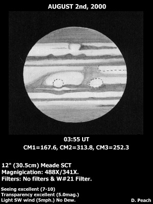 ![]() | I=167.6 II=313.8 III=252.3 D.A. Peach, Kings Lynn, Norfolk, UK. 12" (30.5cm) Meade SCT. Magnification: 488X/341X Filters: Unfiltered & W#21 filter. Seeing excellent (7-10) Transparency excellent (5.0mag) Light SW wind (5mph.) No Dew. | |