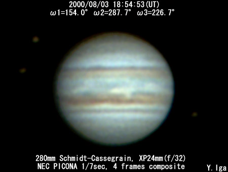 I=154.0 II=287.7 III=226.7 280mm Schmidt-Cassegrain, XP24mm(f/32) NEC Picona 1/7sec, 4 frames composite Seeing:7/10 Transp.:5/5