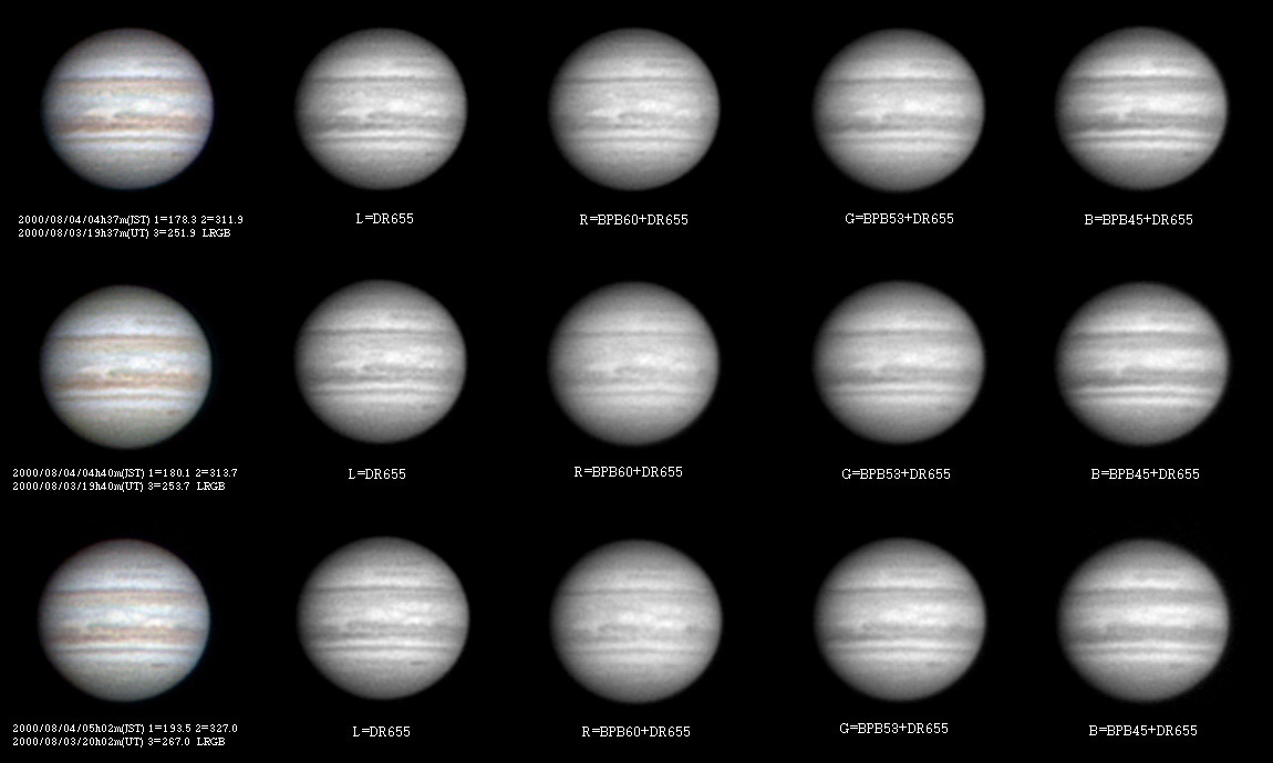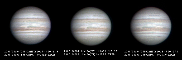 ![]() No. 8 2000/08/03 19h37m(UT) I=178.3 II=311.9 III=251.9 No. 9 2000/08/03 19h40m(UT) I=180.1 II=313.7 III=253.7 No.10 2000/08/03 20h02m(UT) I=193.5 II=327.0 III=267.0 250mm Newton, BITRAN BT-01, LRGB Seeing:7-8/10 Transp.:9/10 | ||