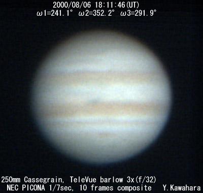 I=241.1 II=352.2 III=291.9 250mm Cassegrain, barlow 3x(f/32) NEC Picona 1/7sec, 10 frames composite | |