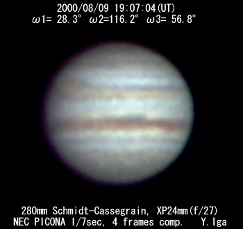 I= 28.3 II=116.2 III= 56.8 280mm Schmidt-Cassegrain, XP24mm(f/27) NEC Picona 1/7sec, 4 frames composite Seeing:5/10 Transp.:2/5