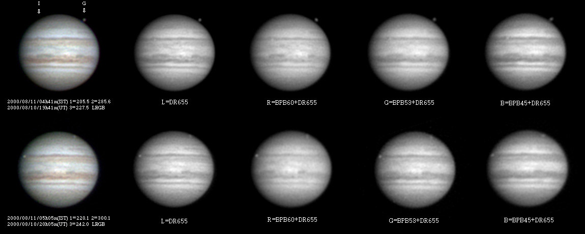 ![]() No.11 2000/08/10 19h41m(UT) I=205.5 II=285.6 III=227.5 No.12 2000/08/10 20h05m(UT) I=220.1 II=300.1 III=242.0 250mm Newton, BITRAN BT-01, LRGB Seeing:6-7/10 Transp.:8/10 | ||
