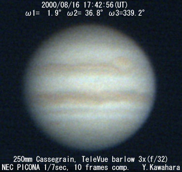 ![]() No. 17 2000/08/16 17:42:56(UT) I= 1.9 II= 36.8 III=339.2 250mm Cassegrain, barlow 3x(f/32) NEC Picona 1/7sec, 10 frames composite | ![]()
