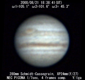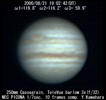 ![]() No. 22 2000/08/21 19:02:42(UT) I=119.8 II=116.2 III= 59.9 250mm Cassegrain, barlow 3x(f/32) NEC Picona 1/7sec, 10 frames composite | ![]()