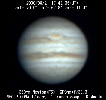 ![]() No. 23 2000/08/21 19:10:16(UT) I=124.4 II=120.7 III= 64.4 250mm Cassegrain, barlow 3x(f/32) NEC Picona 1/7sec, 10 frames composite | ![]()