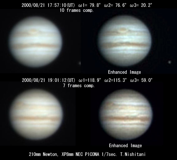 ![]() No. 38 2000/08/21 19:27:06(UT) I=134.6 II=130.9 III= 74.6 De= +3.3 E.Dia=38.18" | ![]() (Enhanced by Y.Iga)