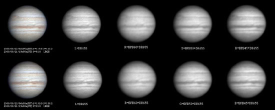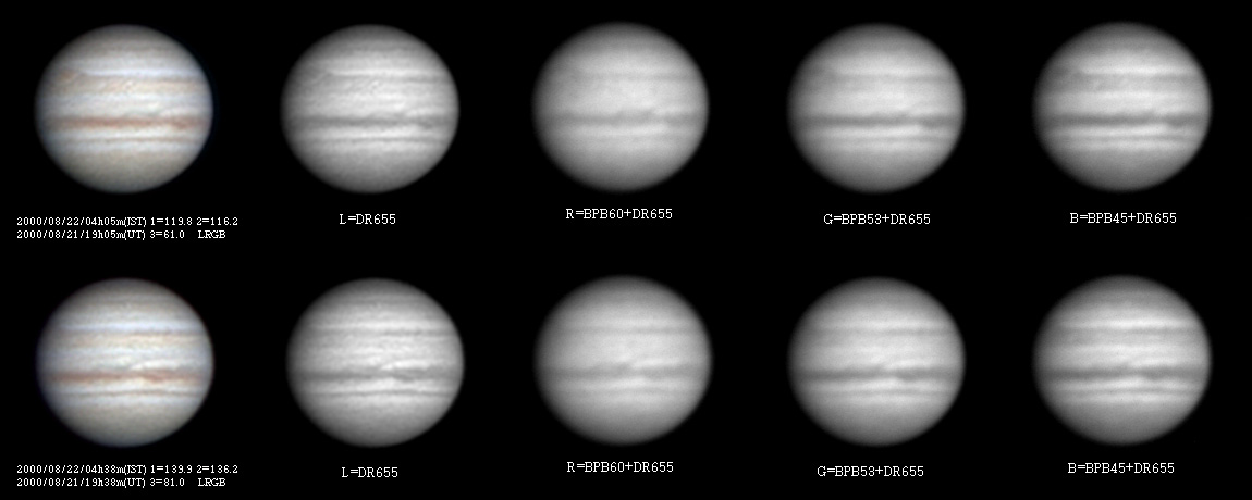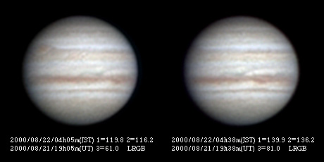 ![]() No.13 2000/08/21 19h05m(UT) I=119.8 II=116.2 III= 61.0 No.14 2000/08/21 19h38m(UT) I=139.9 II=136.2 III= 81.0 250mm Newton, BITRAN BT-01, LRGB Seeing:6/10 Transp.:8/10 | ||
