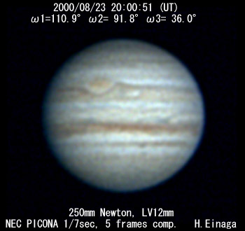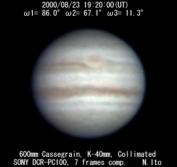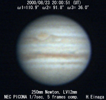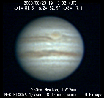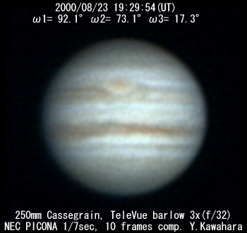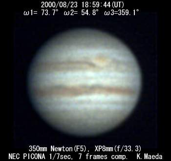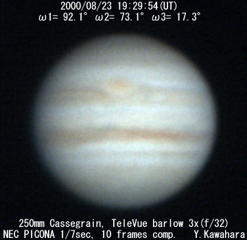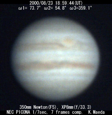 ![]() No. 24 2000/08/23 19:29:54(UT) I= 92.1 II= 73.1 III= 17.3 250mm Cassegrain, barlow 3x(f/32) NEC Picona 1/7sec, 10 frames composite | ![]()