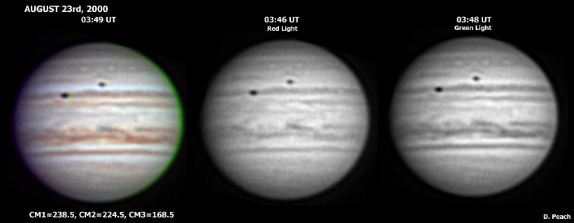 ![]() No. 7 2000/08/23 03:49(UT) I=238.5 II=224.5 III=168.5 D. A. Peach, King's Lynn, Norfolk, UK. 12" (30.5cm) Meade SCT @ f/21.0. ST-5c camera. SBIG RGB Filter set. Total Exposure Times: Red Light (+ IR Rejection): 4.00secs Green Light (+ IR Rejection): 3.80secs Blue Light (+ IR Rejection): 4.40secs Seeing fair-good (5-7.) Transparency excellent (5.0mag) Wind E (0 - 5mph.) Heavy dew. | ||