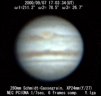 ![]() No. 7 2000/09/07 17:31:14(UT) I=228.0 II= 95.2 III= 43.4 210mm Newton, XP8mm NEC Picona 1/7sec, 10 frames composite | ![]() (Enhanced by Y.Iga)