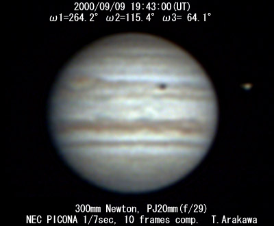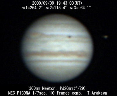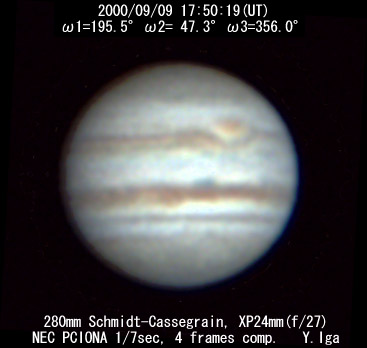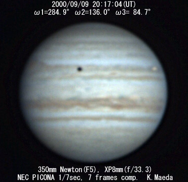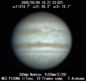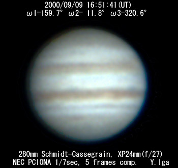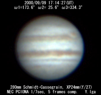 ![]() No. 5 2000/09/09 18:15:30(UT) I=210.8 II= 62.5 III= 11.2 300mm Newton, PJ20mm(f/29) NEC Picona 1/7sec, 9 frames composite | ![]() (Enhanced by Y.Iga) | |