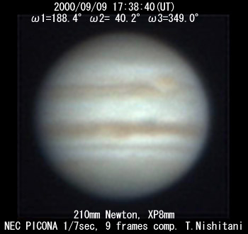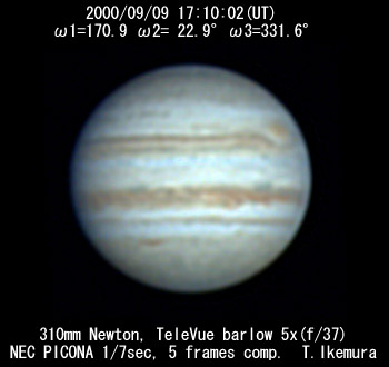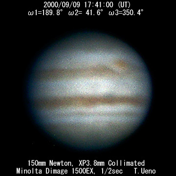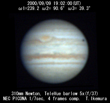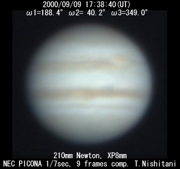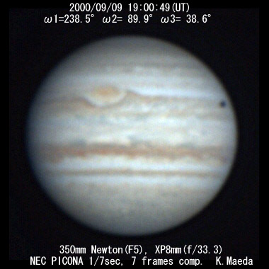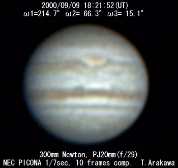 ![]() No. 10 2000/09/09 19:43:00(UT) I=264.2 II=115.4 III= 64.1 300mm Newton, PJ20mm(f/29) NEC Picona 1/7sec, 10 frames composite | ![]() (Enhanced by Y.Iga) | |