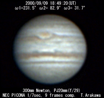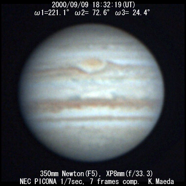 ![]() No. 9 2000/09/09 19:32:56(UT) I=258.0 II=109.3 III= 58.0 300mm Newton, PJ20mm(f/29) NEC Picona 1/7sec, 10 frames composite | ![]() (Enhanced by Y.Iga) | |