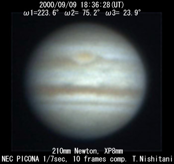 ![]() No. 10 2000/09/09 18:36:28(UT) I=223.6 II= 75.2 III= 23.9 210mm Newton, XP8mm NEC Picona 1/7sec, 10 frames composite | ![]() (Enhanced by Y.Iga)