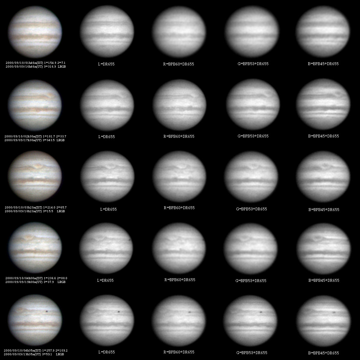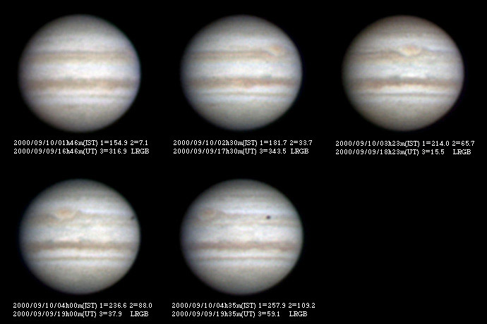 ![]() No.17 2000/09/09 16h46m(UT) I=154.9 II= 7.1 III=316.9 No.18 2000/09/09 17h30m(UT) I=181.7 II= 33.7 III=343.5 No.19 2000/09/09 18h23m(UT) I=214.0 II= 65.7 III= 15.5 No.20 2000/09/09 19h00m(UT) I=236.6 II= 88.0 III= 37.9 No.21 2000/09/09 19h35m(UT) I=257.9 II=109.2 III= 59.1 250mm Newton, BITRAN BT-01, LRGB Seeing:4-6/10 Transp.:8/10 | ||