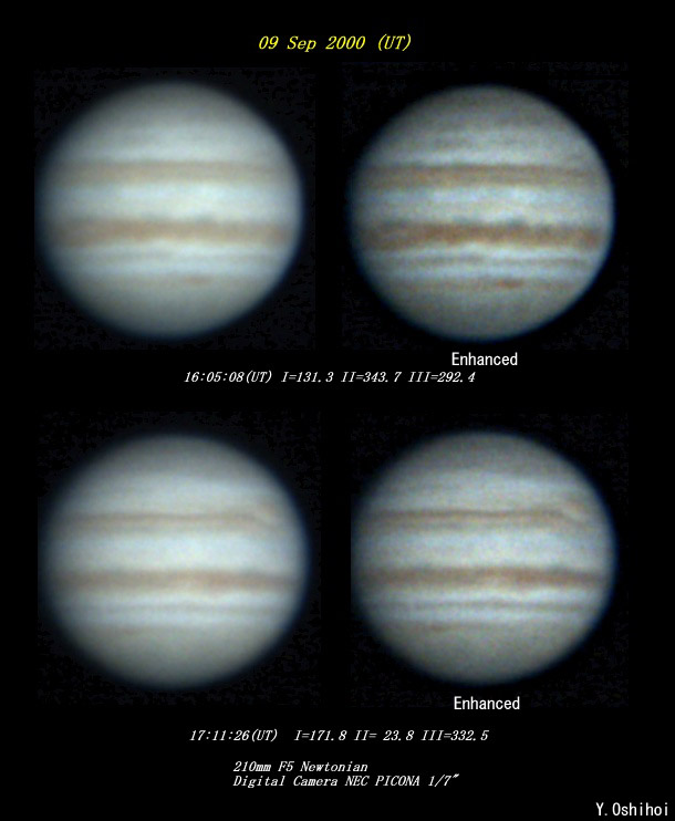 ![]() No. 68 2000/09/09 18:32:19(UT) I=221.1 II= 72.6 III= 24.4 | ![]() (Enhanced by Y.Iga)