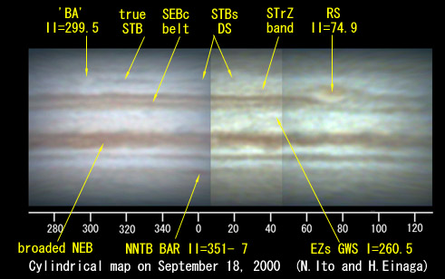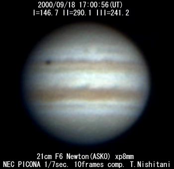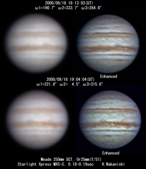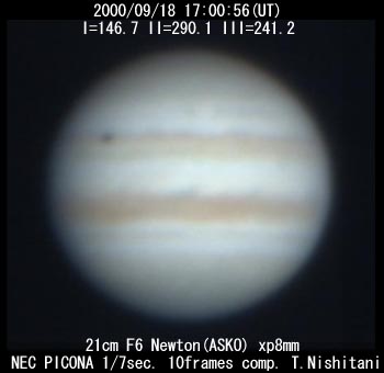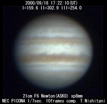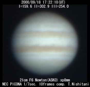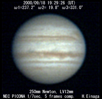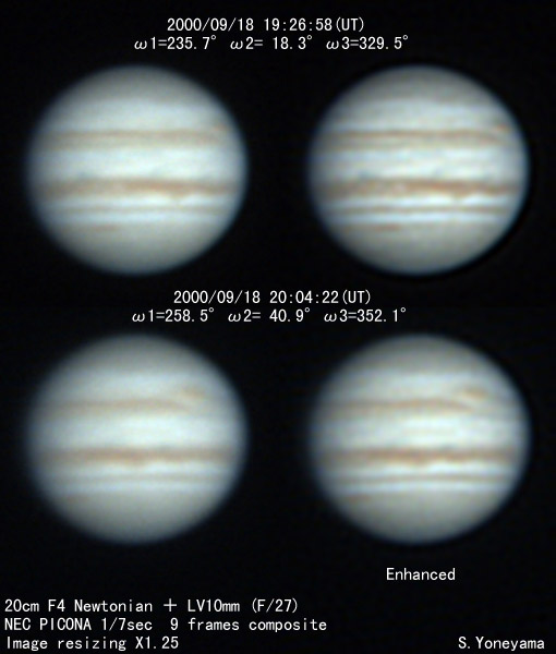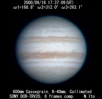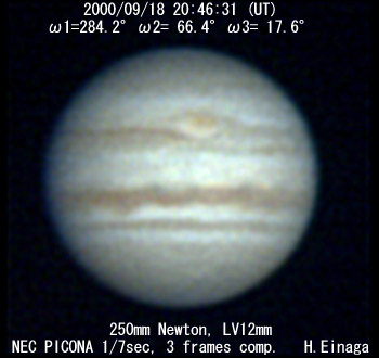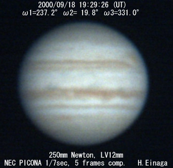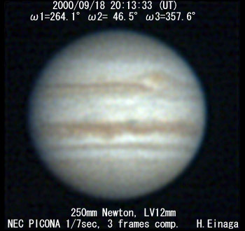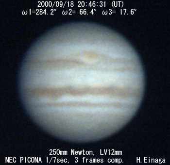 ![]() No. 14 2000/09/18 17:22:10(UT) I=159.6 II=302.9 III=254.0 210mm Newton, XP8mm NEC Picona 1/7sec, 8 frames composite | ![]() (Enhanced by Y.Iga)