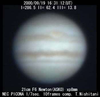 ![]() No. 15 2000/09/19 16:31:12(UT) I=286.5 II= 62.4 III= 13.8 210mm Newton, XP8mm NEC Picona 1/7sec, 10 frames composite | ![]() (Enhanced by Y.Iga)