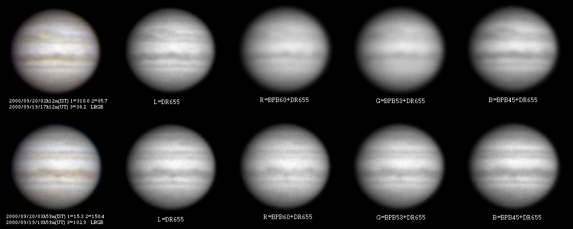 ![]() No.22 2000/09/19 17h12m(UT) I=310.0 II= 85.7 III= 38.2 No.23 2000/09/19 18h59m(UT) I= 15.3 II=150.4 III=102.9 250mm Newton, BITRAN BT-01, LRGB Seeing:5/10 Transp.:9/10 | ||