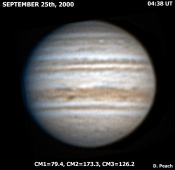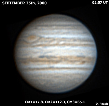 INFORMATION FOR JUPITER IMAGES, SEPTEMBER 25th, 2000. D. A. Peach, King's Lynn, Norfolk, UK. 12" (30.5cm) Meade SCT @ f/21.0. ST-5c camera. SBIG RGB Filter set. Total Exposure Times: Red Light (+ IR Rejection): 5.70secs Green Light (+ IR Rejection): 4.90secs Blue Light (+ IR Rejection): 5.20secs Integrated Light (no IR Rejection): 1.80secs Seeing good (6-8.) Transparency excellent (5.0mag), but occasional low clouds late. Wind again blustery - SW 5-15mph. Heavy dew. | ||