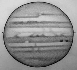 SEBsはω2=240°付近まで暗斑が連続していて、その後方は一定して濃い模様である。SEBnは大赤斑の後方のω2=120°付近から中央組織が濃くなっていて、この様相は330°付近まで続いている。注目すべきは、ω2=309°のSEBZにある経度方向に伸びる白斑である(浅田、堀川)。この白斑は5月26日の浅田のCCD画像(ω2=305°付近)、5月31日の伊賀のスケッチ(ω2=303°)にも捉えられている。