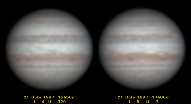 SEBは全体がshade状であるが、シーイングが良い瞬間にはSEBsが暗斑群に、SEBnは中央組織と一体となって濃いのがわかる。2枚目のCM右にSEBZの白斑が見えてきた。