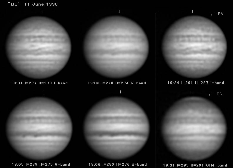 ※注(伊賀) 左は各種の波長による画像です。I,R,V,B,Methaneのそれぞれの波長を使用しています。 マージしたBEはメタンバンド(CH4)で明るいのですが、さらに青色光(B)でも明るく見えています。これまでの永続白斑とは挙動が異なるようです。マージの影響が現われていると考えられます。 |