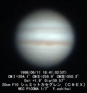 ![]() 1998/06/11 18:06(UT) I=241.9 II=237.9 Seeing:7/10 Transp.:8/10 |