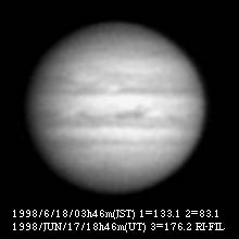 ![]() No.17 1998/06/17 18:47(UT) I=135.4 II= 85.4 Seeing:4-5/10 Transp.:3/5 x311 |