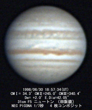![]() No.20 1998/06/30 17:30(UT) I=341.2 II=192.4 Seeing:3-4/10 Transp.:2-1/5 x311 |