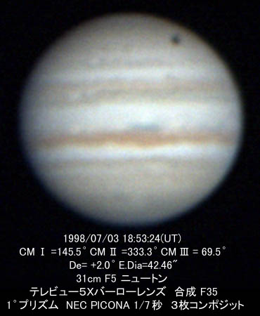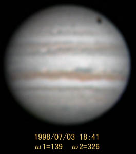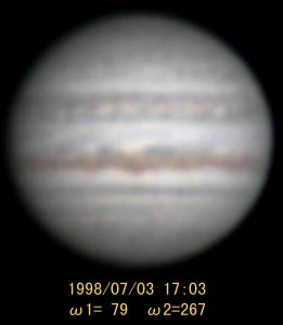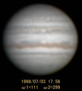 ![]() No.24 1998/07/03 18:03(UT) I=115.1 II=303.2 Seeing:4-5/10 Transp.:2/5 x311 |