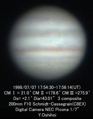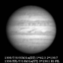 ![]() No.26 1998/07/07 16:34(UT) I=332.8 II=130.9 Seeing:1/10 Transp.:3/5 x360 |