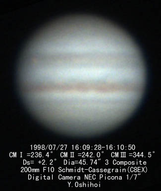 ![]() No.8 1998/07/27 17:20(UT) I=280.1 II=285.2 Seeing:7/10 Transp.:4/5 x257 |