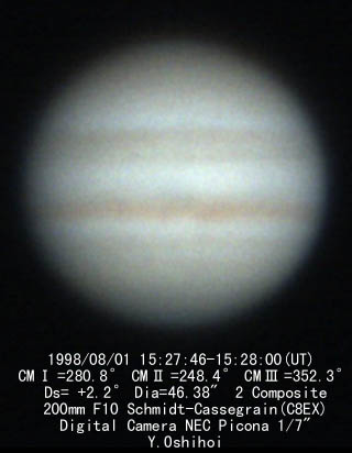 ![]() No.27 1998/08/01 16h41m(UT) I=326.2 II=293.4 Seeing:6/10 Transp.:2/5 x200 |