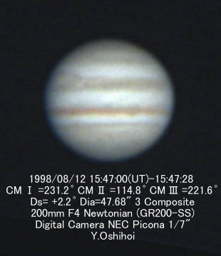![]() No.36 1998/08/12 14h58m(UT) I=201.6 II= 85.3 Seeing:6/10 Transp.:3/5 x200 |