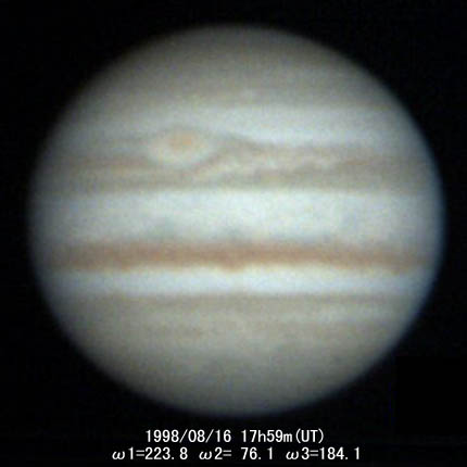 ![]() No.67 1998/08/16 14:03(UT) I= 80.0 II=293.5 Seeing:2/10 Transp.:3/5 x390 |