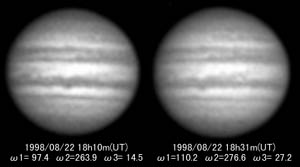 ![]() No.20 1998/08/22 16:58(UT) I= 54.9 II=221.8 Seeing:6/10 Transp.:5-4/10 |